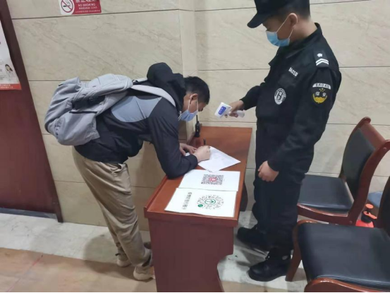 各派住单位的一线保安员,应对来访人员要坚持测温、出示健康码、扫码登记等防控措施。督促其进入派驻单位按规定做好个人防护,戴好口罩。